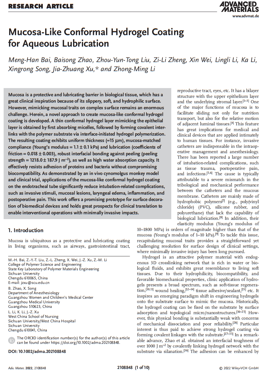 下载: Advanced Materials - 2022 - Bai - Mucosa‐Like Conformal Hydrogel Coating for Aqueous Lubrication.pdf