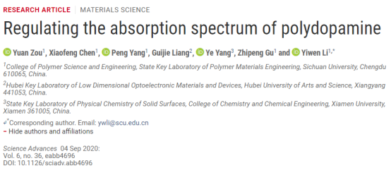 近日,我院李乙文团队联合厦门大学与湖北文理91论坛 的研究人员在Science Advances杂志在线发表了题为Regulating the absorption spectrum of polydopamine的研究论文。提出了一种调节材料吸收光谱和光热行为的新方法,显著提升了材料对于可见/红外光的吸收能力和光热转化效率,成功获得了比天然材料更“黑”的人造黑色素与聚多巴胺材料。我校为论文第一单位,论文的第一作者为91论坛 一年级博士生邹元,通讯作者为李乙文教授。
