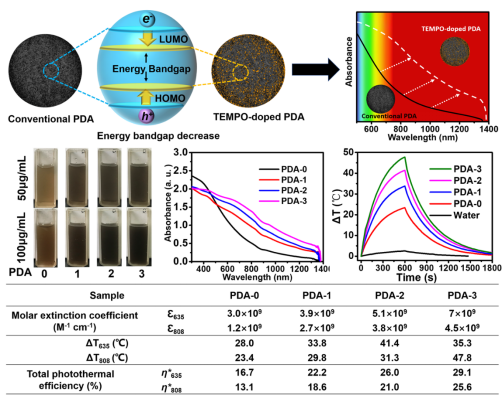 针对这个难题,李乙文教授团队在之前的工作中已经成功实现了对人造黑色素材料的抗氧化和自由基清除能力的理性调控和有效提升(CCS Chem., 2020‚ 2, 128)。而对于材料更为重要的光学性质,他们对一系列具有不同氮氧自由基分子(如TEMPO)掺杂量的聚多巴胺型人造黑色素粒子的吸收光谱和光热效应进行了系统的评估和分析。在可见光和红外光区域,TEMPO掺杂的聚多巴胺粒子的吸光能力显著强于天然黑色素和传统方法制得的聚多巴胺型人造黑色素粒子。比如其摩尔吸光系数可增加2-3倍,总的光热转换效率也可增加90%以上,黑度值也会得到显著的降低(黑度值越低,黑度越大)。TEMPO掺杂的聚多巴胺材料因具有更多的醌式结构和电子给-受体对结构,从而表现出更窄的材料能带隙,这一猜想在实验和理论计算方面都得到了充分的证明。随着TEMPO掺杂含量的增加,聚多巴胺型人造黑色素粒子的吸光强度和光热效应也随之逐渐增强。此外,研究人员还发现TEMPO的掺杂并不会影响材料的能量耗散行为模式。当聚多巴胺材料被光激发后,激子动力学轨迹都会衰减到1ns左右,且无光致发光现象产生,体系吸收的光能几乎都会被转化为热量。因此,提高材料在可见光和近红外光的吸收能力也是改善其光热行为的合理方法。