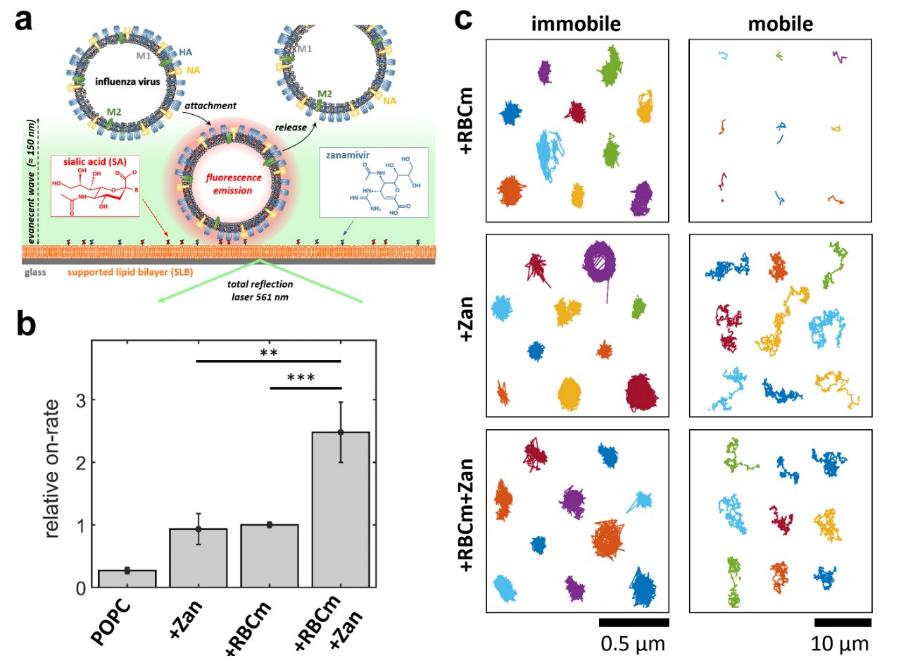 图3. 基于全内反射荧光法(TIRF)观察的改性红细胞膜与病毒颗粒之间的多价键相互作用。
