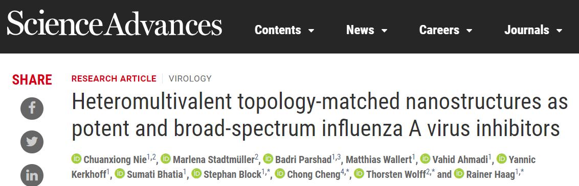 近日,我院程冲研究员团队联合德国柏林自由大学Rainer Haag教授等研究人员在高分子基病毒抑制剂领域取得的重要研究成果,相关研究已经在国际顶级期刊Science Advances在线发表(Heteromultivalent topology-matched nanostructures as potent and broad-spectrum influenza A virus inhibitors)。该合作团队报道了一种具有拓扑匹配结构的新型多价高分子纳米制剂,其可实现高效广谱的抑制流感病毒。相对于传统的抑制剂,该多价纳米制剂对病毒的抑制浓度可低至32.4±13.7 μg/mL,并可以减少99.99%的病毒传播。由于在新冠病毒也具有类似的结构,研究团队预期该研究结果将有助于新冠病毒高分子抑制剂的研发。论文的第一作者为我院优秀硕士毕业生聂川雄,现为柏林自由大学博士后。