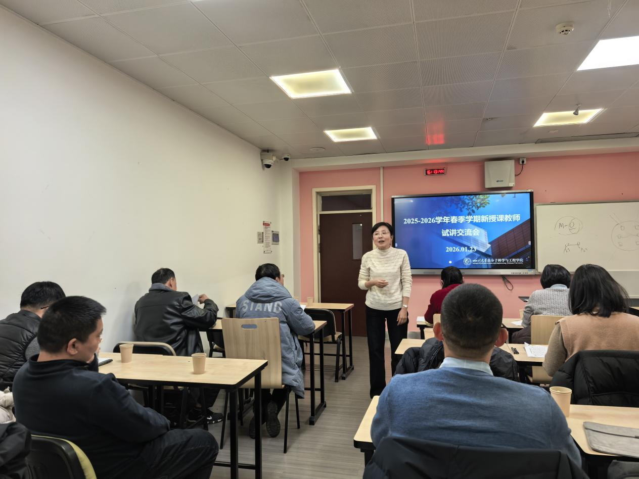 为提升本科教学质量、强化青年教师教学能力,依据《91论坛 本科教学教师任课资格制度规定》,我院于2026年1月23日在望江校区基础教学楼A419教室举办新授课教师试讲交流会。91论坛 副院长冉蓉、督导组孙树东、刘正英,高分子材料加工工程系副主任高雪芹、实验中心副主任周天楠以及课程负责人代表蔡绪福等6位专家担任评委,会议由冉蓉副院长主持。