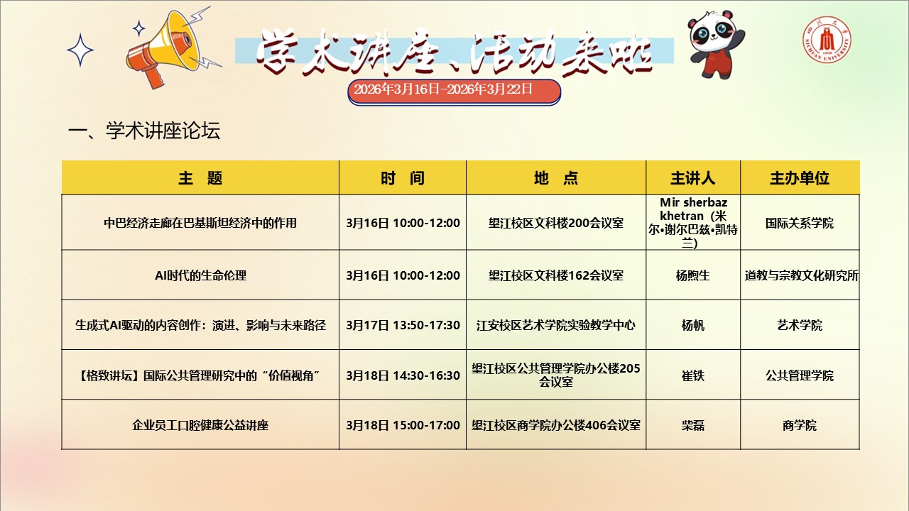 学术讲座预告(2026年3月16日-2026年3月22日)