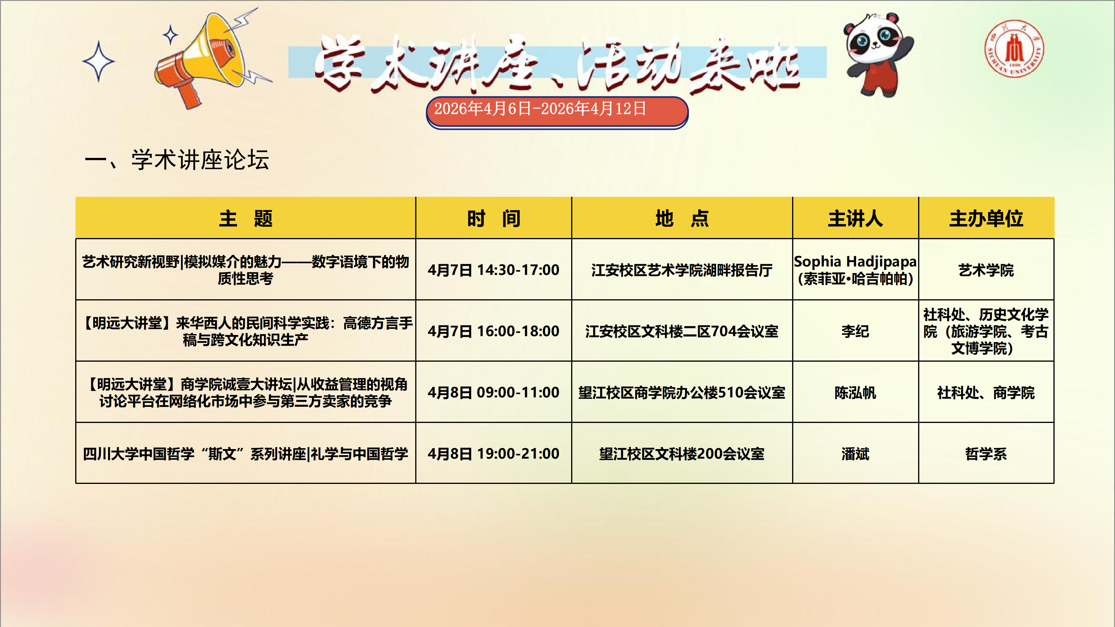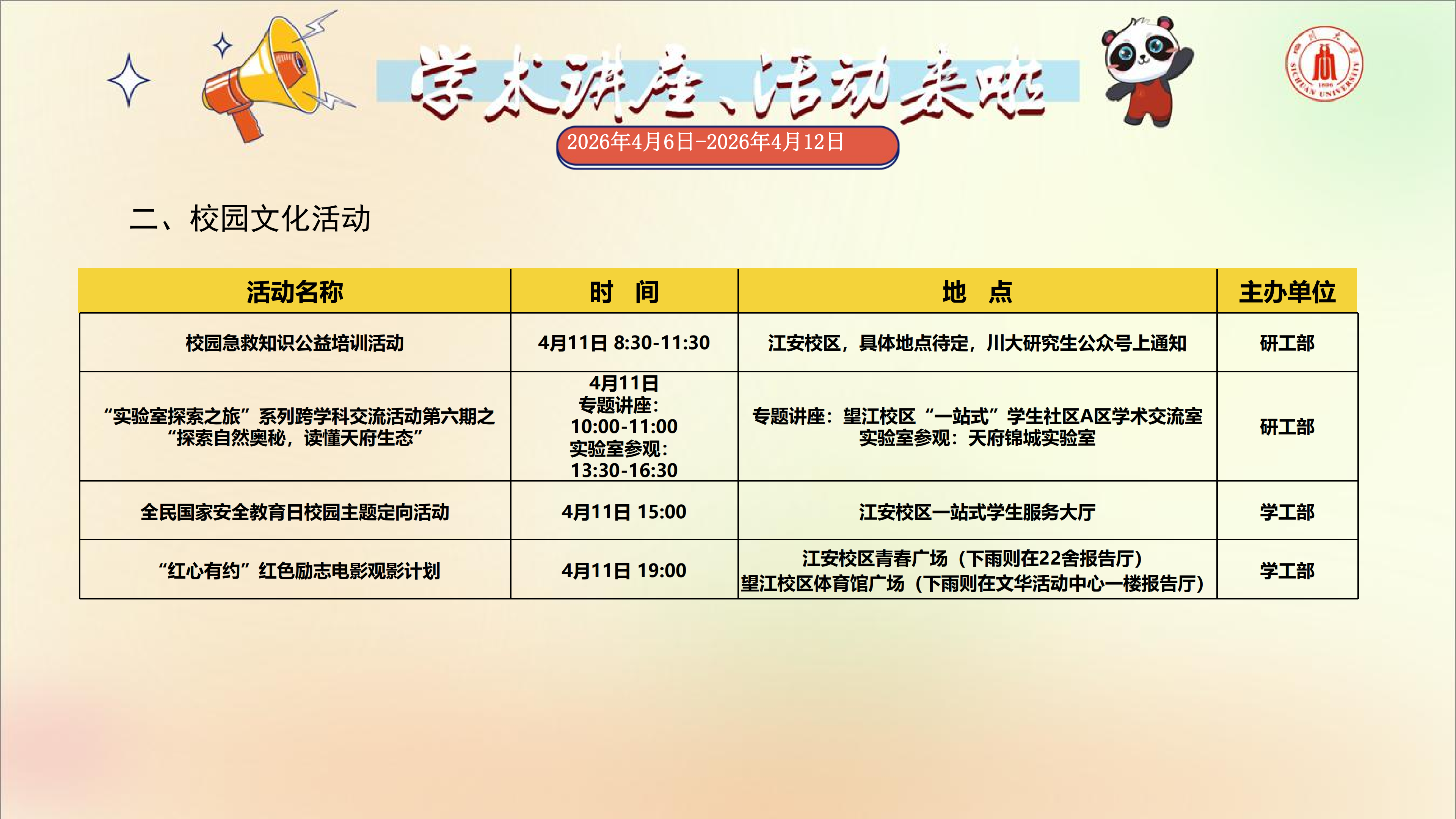 学术讲座与校园文化活动预告(2026年4月6日-2026年4月12日)