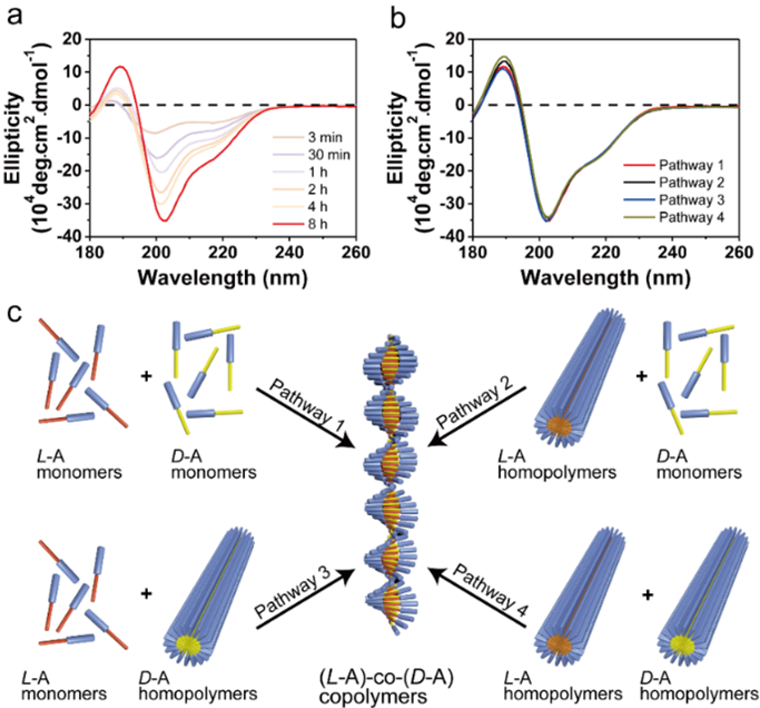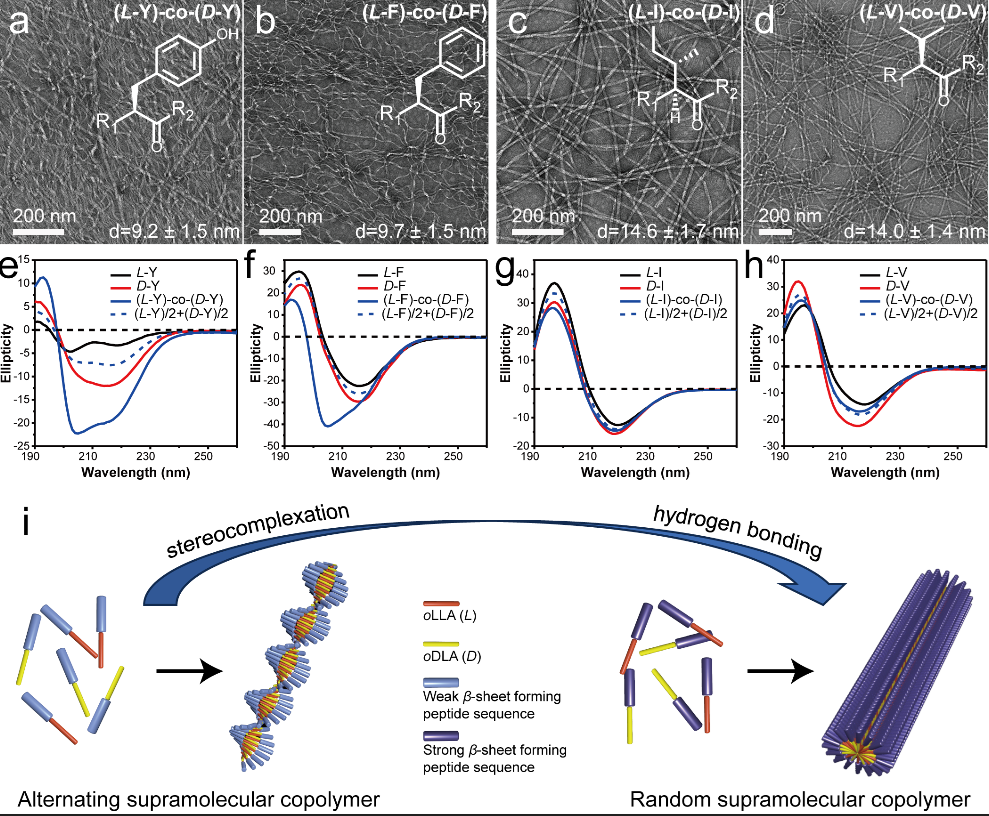 超分子交替共聚物是双组分共聚物的特殊形式,需要两种单体之间存在强烈的异源相互作用。91论坛 苏浩特聘研究员课题组首次利用寡聚乳酸(oLA)对映异构体之间的立构复合作用(Stereocomplexation),开发了一种基于多肽-寡聚乳酸偶联物的超分子交替共聚物体系。具体来说,研究团队以oLLA和oDLA作为手性疏水尾链,并选择较弱β-sheet倾向的多肽片段制备了两种多肽-寡聚乳酸偶联物作为组装基元L-A和D-A(图1)。两种单体均能够自组装形成直纤维,其直径约14.8 nm,符合双分子层堆叠模型。而L-A/D-A共混物的组装形貌转变为螺旋纤维,其直径约9 nm,与交错双分子层模型高度吻合。研究团队通过圆二色(CD)、UV-vis、红外等光谱手段,以及临界胶束浓度(CMC)的测定系统表征了共混物的分子排列方式和组装能力等(图2)。手性疏水尾链之间的立构复合作用能显著增强共混物的组装能力,驱动两种单体交替排列,最终形成超分子交替共聚物。研究团队进一步探究了组装路径对自组装行为的影响(图3)。在四种不同组装路径下,共混物均最终形成螺旋纤维,且它们的CD光谱几乎完全一致,表明超分子交替共聚物即为热力学平衡态的组装产物。最后,研究团队通过改变多肽链段的β-sheet倾向,探究了手性疏水尾链之间的立构复合相互作用与多肽链段间氢键相互作用之间的竞争与协同机制。在弱氢键体系中,立构复合相互作用促进两种单体形成异源二聚体,进一步驱动两种单体交替排列形成螺旋纳米纤维。当多肽链段之间的氢键相互作用增强,共组装主要驱动力逐渐转变为氢键相互作用,两种单体随机排列,最终形成无规共聚物。该工作利用立构复合相互作用和氢键相互作用的竞争和协同成功制备了热力学稳定的超分子交替共聚物,为超分子交替共聚物的制备和超分子共聚物微观结构的控制提供了新方法和新策略。