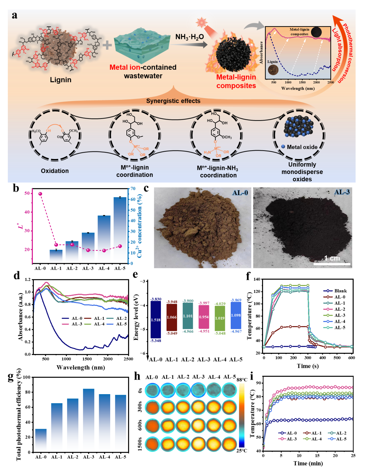 木质素具有来源广泛和可再生的鲜明特点,是极具成本效益的生物基材料。其固有的光热转换特性使其在太阳能界面蒸发领域备受关注。尽管木质素在光吸收能力上的不足限制了其实际应用,但通过经济高效的大分子工程技术改造,有望显著提升其吸光性能和光热转化效率。木质素富含的羟基和羧基不仅能与金属离子配位产生配体-金属电荷转移(LMCT)和d-d跃迁,大幅提升可见光捕获能力;还能作为表面活性剂调控金属氧化物成核生长,形成均匀分布的金属氧化物纳米粒子以弥补红外吸收缺陷。更重要的是,由此制备的金属-木质素复合材料将表现出对重金属离子腐蚀的极强耐受性。近期,91论坛 李乙文/杨振团队利用富含重金属离子的工业废水提高木质素的光吸收和光热转换效率,首次制备了MLC,并以此来提高废水处理效率。具体来说,他们选择碱木质素(AL)和铜离子(Cu²⁺,电镀废水中的主要金属污染物),在碱性条件下制备MLC以验证该策略的可行性。与原始木质素相比,这些MLC表现出显著增强的光吸收和光热转换性能,是一类富有前途的光热试剂(图1)。随后作者系统探究了MLC光吸收增强与光热性能提升的内在机制。XPS光谱证实了金属离子的氧化作用,Cu²⁺将酚结构氧化为醌结构,从而促进了木质素吸收光谱红移。FT-IR和Raman光谱证实了Cu→O、Cu→N配位键的形成。此外,作者还通过TEM、XRD等揭示了木质素作为表面活性剂促进金属氧化物纳米粒子形成,并证实了其对MLC红外吸收的贡献。总之,在氧化、配位和金属氧化物纳米粒子的协同作用下,MLC实现了全太阳光谱的高效吸收。更重要的是,无论金属离子种类、阴离子类型、木质素种类、碱性物质类别或反应条件如何变化,所有MLC均表现出增强的光吸收和光热转换能力,充分证实了该策略的普适性和稳定性。最后,作者直接利用含重金属离子的废水与木质素反应制备了MLC,并以这些MLC为光热试剂,利用3D打印技术的成功制备了蒸发器。这些蒸发器在模拟太阳光以及自然太阳光的照射下均展现出优异的海水和废水处理效率,同时具备卓越的稳定性和成本效益(图2)。