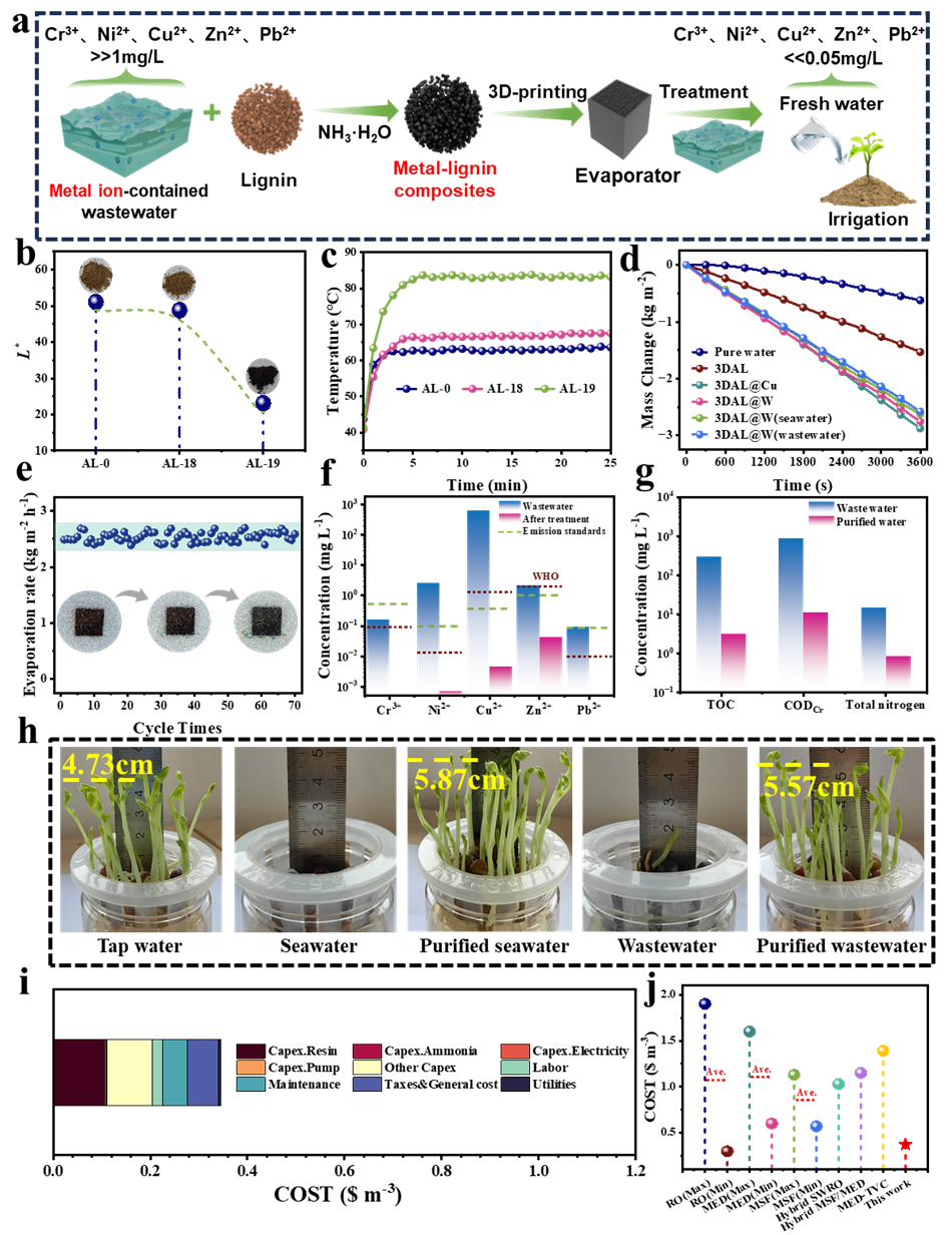 传统工业流程(如电镀、采矿和电子制造)产生的废水中常含有重金属离子(Cr³⁺、Ni²⁺、Cu²⁺和Pb²⁺等),这些离子无法在污水处理厂的生物降解过程中被有效净化。因此,工业废水已成为最具危害性的污染物之一,对生态系统和公共健康构成严重威胁。而太阳能界面蒸发技术凭借其环保可持续的能源输入方式展现出独特优势。但该技术的实际应用仍面临两大关键限制:传统光热材料的高成本阻碍了规模化应用;且在污水处理过程中易受重金属离子腐蚀,导致材料失活和蒸发效率骤降。因此,开发具有强重金属耐受性的低成本光热剂已成为解决水处理挑战的关键突破点。