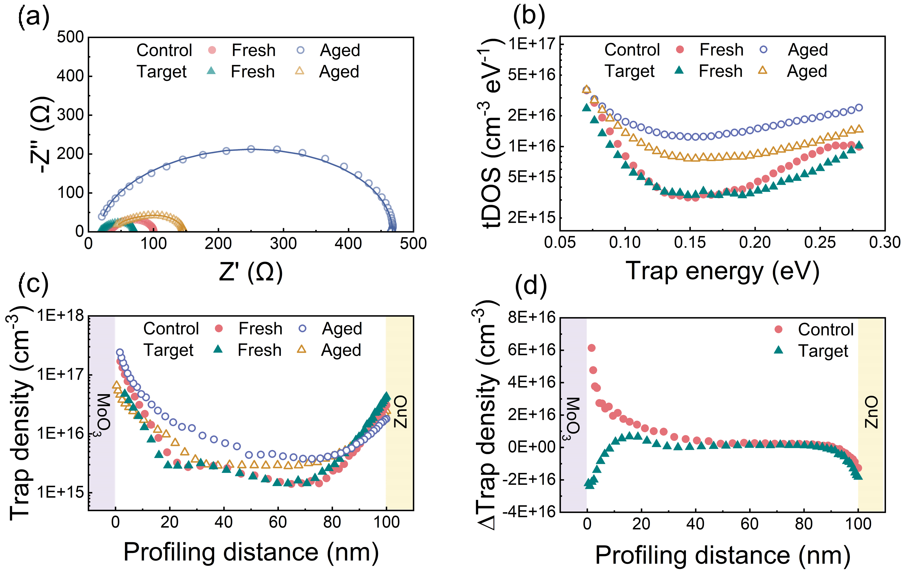图5.(a) 含与不含IPE的器件在新制备态和老化态的阻抗谱。(b) 陷阱态密度分布随陷阱能量的变化。(c) 活性层内不同深度处的陷阱密度;左侧和右侧区域分别对应邻近MoO3和ZnO的界面。(d) 老化后陷阱密度随深度的变化;左侧和右侧区域分别对应靠近MoO3和ZnO的界面。