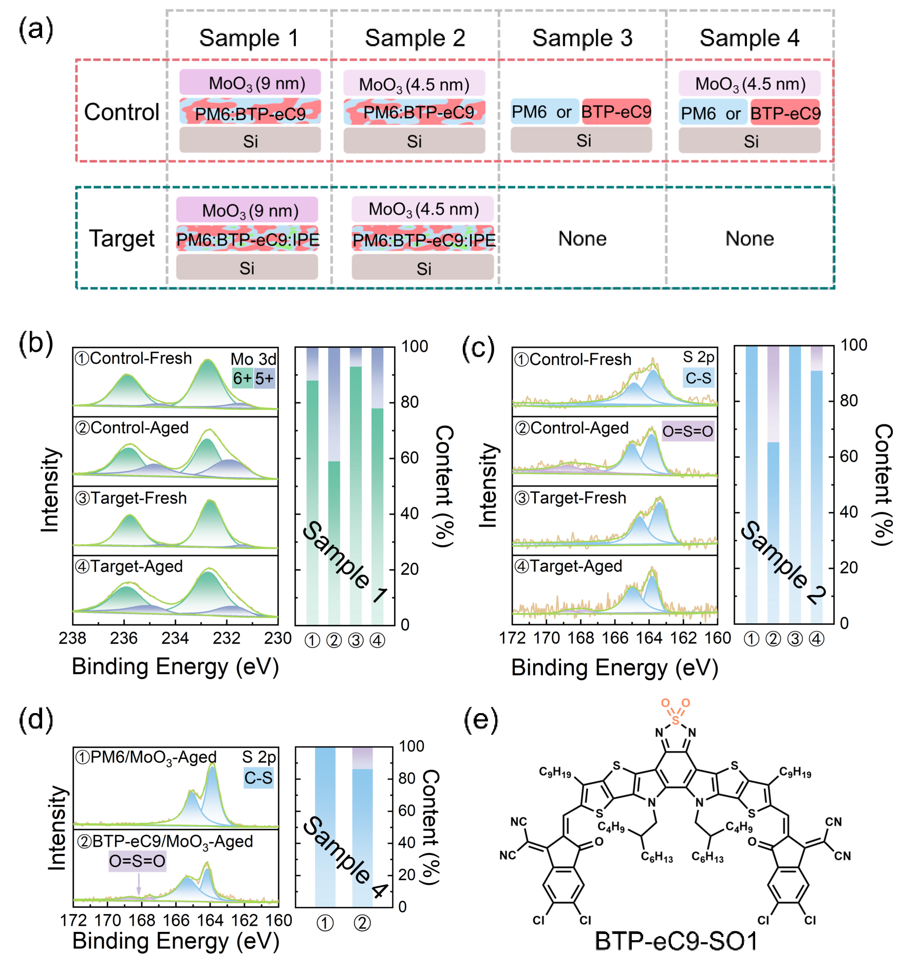 图4.(a) XPS表征设计的样品结构示意图。(b) 样品1在热老化前后的XPS Mo 3d谱图。(c) 样品2在热老化前后的XPS S 2p谱图。(d) 样品4在热老化后的XPS S 2p谱图。(e) 最可能的氧化产物BTP-eC9-SO1的推测结构式。