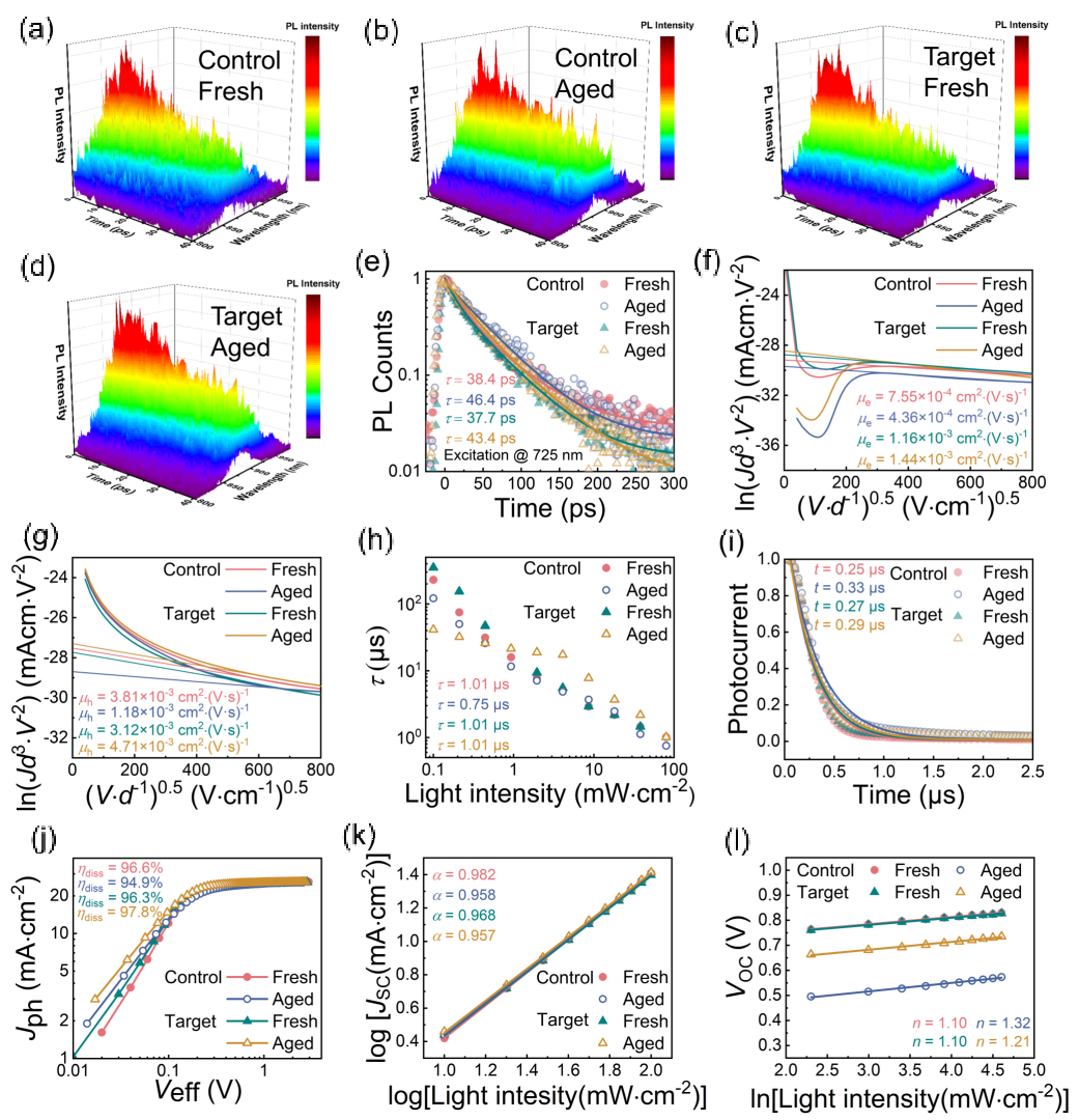 图7.(a-d) 归一化时间分辨光致发光光谱数据的三维图。(e) 四种不同薄膜测量的时间分辨光致发光衰减动力学曲线。相应薄膜的 (f) 电子迁移率和 (g) 空穴迁移率。(h) 相应器件的瞬态光电压和 (i) 瞬态光电流衰减曲线。(j) 相应器件的光生电流密度-有效电压曲线。相应器件的 (k) 短路电流密度和 (l) 开路电压随光照强度的变化关系。