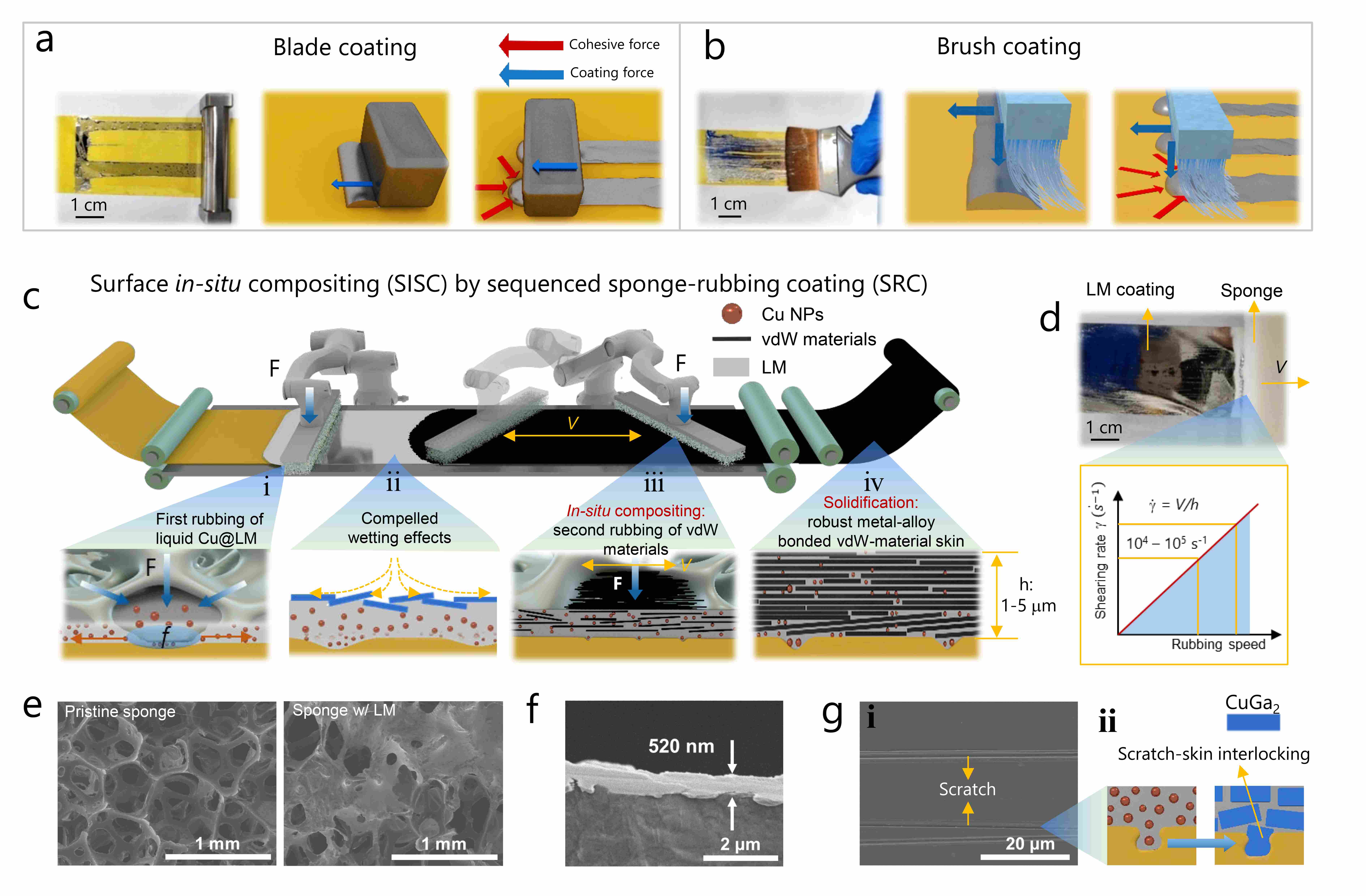 针对上述难题,王宇/杨伟团队在“微粘控”创新思路下,发现了泡棉擦涂可以强化LM界面粘附和润湿的现象(简称强迫润湿现象),并由此提出了表面原位复合策略(surface in situ compositing, SISC),巧妙利用泡棉擦涂过程中的剧烈摩擦、挤压和强剪切作用,实现LM-Cu在聚合物表面的强迫润湿、与多层石墨烯(MLG)等二维材料原位复合以及原位固化反应,最终成功构筑出兼具导电性、耐磨性和界面稳定性的类皮肤材料功能涂层。该工作以《Surface In-Situ Compositing of Reactive Liquid-Metal Anchored 2D Nanomaterial Skins for Active Composite Current Collectors》为题,发表于Advanced Materials。