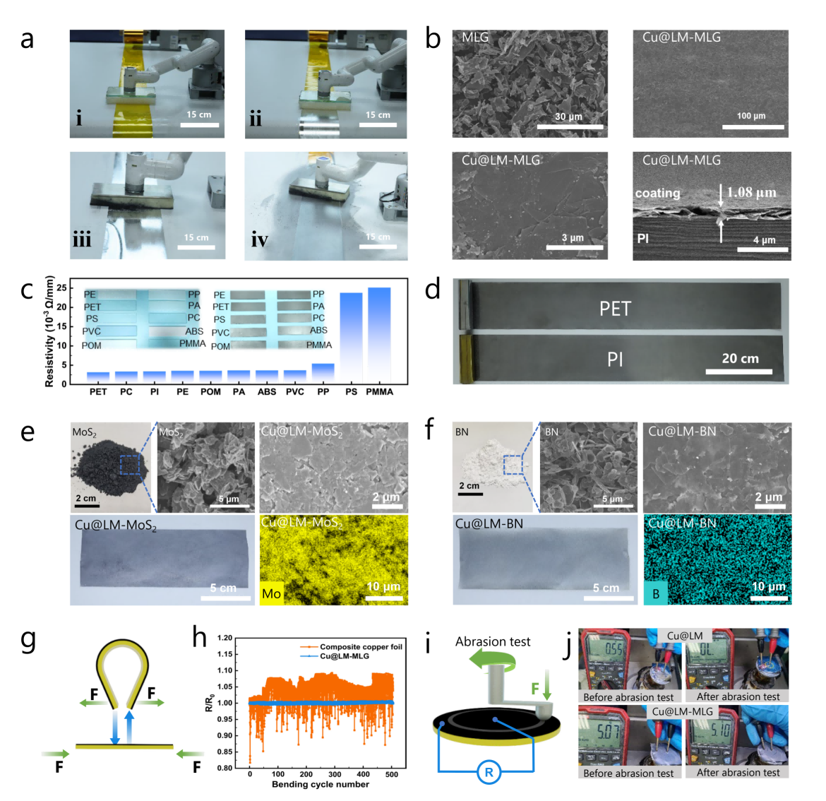 如图2所示,泡棉擦涂并非只适用于单一体系,而是表现出较好的普适拓展能力。通过调控擦涂压力和二维材料类型,可实现复合皮肤厚度与组成的可控构筑;同时,该方法可应用于多种聚合物基底,并拓展到氮化硼和二硫化钼等不同二维材料体系。进一步测试表明,所得Cu@LM-MLG皮肤在500次弯折后电阻变化率仍低于1%,且在磨损条件下仍保持较好导电稳定性,说明该策略不仅具有普适性,也具备较好的结构耐受性。