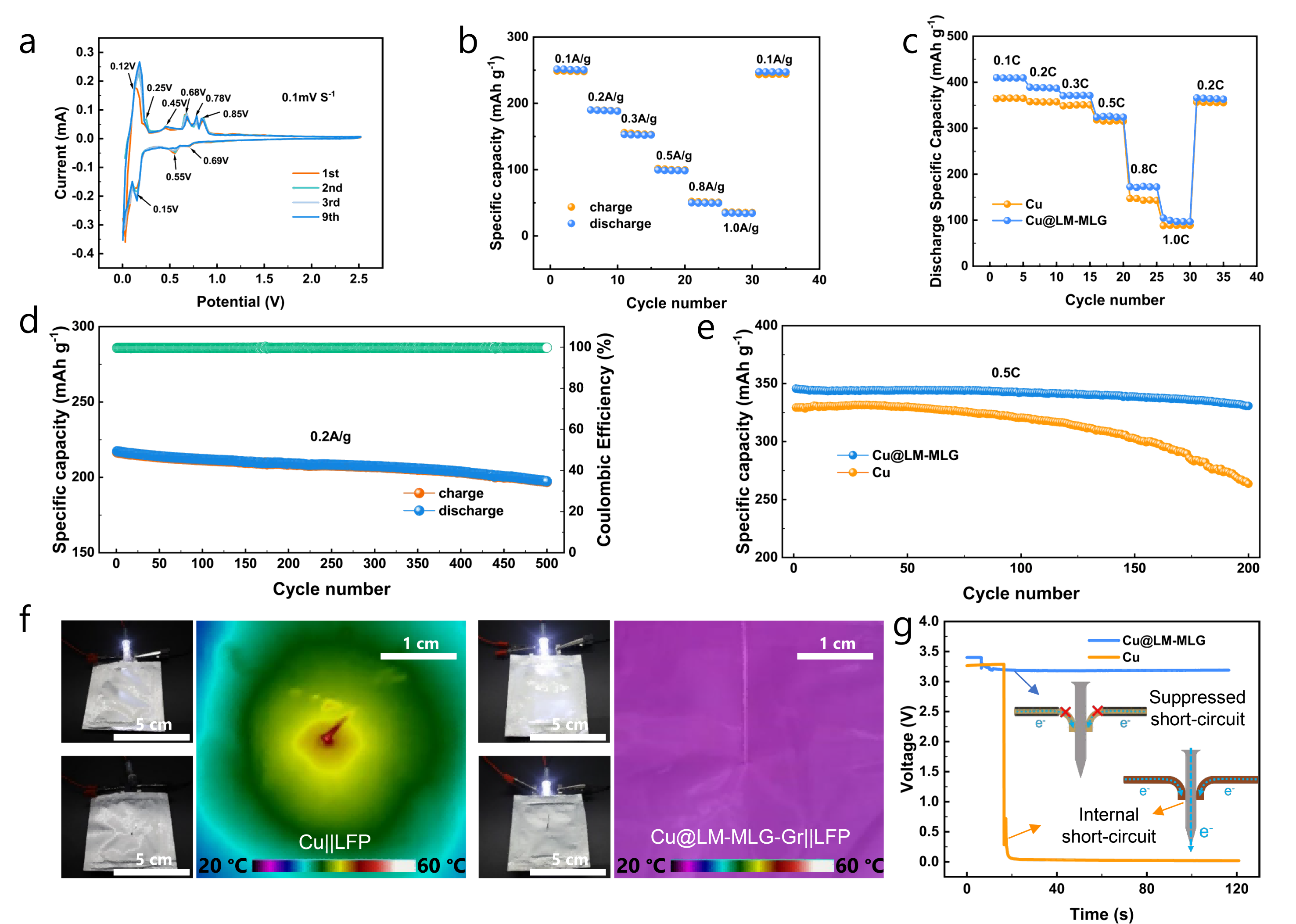 如图3所示,基于Cu@LM-MLG功能皮肤构筑的复合集流体在电化学性能和安全性方面均表现出独特的优势。与传统铜箔体系相比,采用该复合集流体的石墨电极在倍率性能和循环稳定性上更优,且由于使用了具有一定电化学活性的液态金属和石墨烯,从而成为能提供额外容量的活性集流体。它制备的石墨负极在0.5 C循环200次后仍保持330.7 mAh·g⁻¹的可逆放电比容量和95.7%的容量保持率。更重要的是,在针刺测试中,传统铜箔电池迅速短路失效并伴随明显温升,而采用Cu@LM-MLG复合集流体的电池仍可维持稳定输出且无明显温升,表明该功能皮肤在提升电池能量密度的同时,也具有改善安全性能的潜力。不仅如此,该功能皮肤涂层还具有优秀的电热转换、光热转换等特性,在电池热管理、光能捕获等领域具有应用潜力。